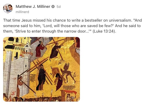 Now an apology. I truly hate internet debates (and Substack’s awkward comment thread formatting doesn’t help), and I’m genuinely sorry to have stirred one up by making a sarcastic remark about confirmed universalists that emerged from hearing Christ’s words read aloud during an evening prayer service. I did not intend to cast aspersion on all who believe in universalism or who have written about it, but only to maintain room for those such as myself who consider that this particular path of inquiry is best left open. The hope-not-doctrine position seems to be drawing more and more aspersion of late (“worse than Arianism,” said one interlocutor to me), but I take it the hell of uncool theological opinions is only purgative, not eternal.